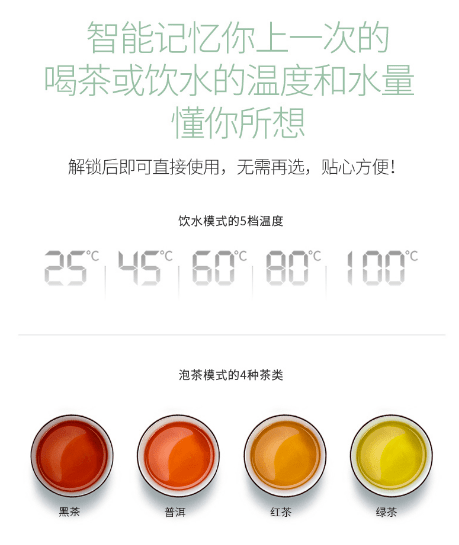 针对不同茶叶,还有多段水温可选。专属的水温不会破坏茶的口感。