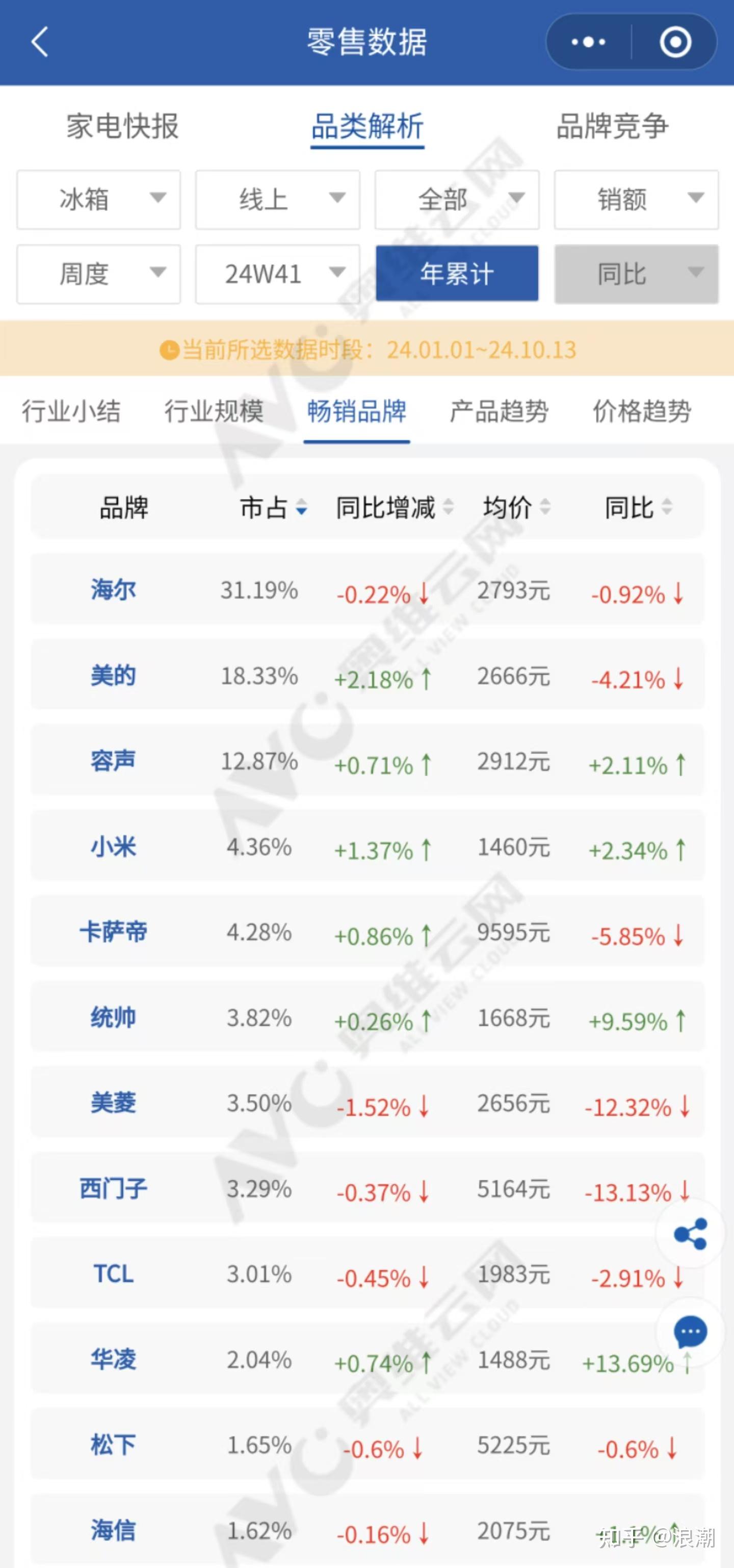 2024年1月份累计到10月份,中国冰箱线上市场销售份额,排名第一是海尔,第二是美的,第三是容声,然后是小米、卡萨帝、统帅等冰箱品牌。下面挑几个比较常见的冰箱牌子说一下。