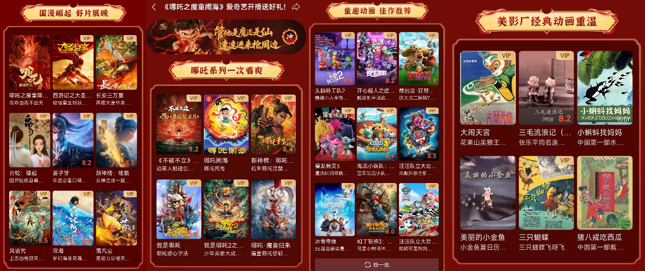 此外,爱奇艺平台同步推出精品动画片单专题,打造全龄段观影宇宙。片单集结《长安三万里》《深海》等展现东方美学的新锐国漫佳作;从《哪吒闹海》《哪吒之魔童降世》到《哪吒2》幕后纪录片《不破不立》一键解锁哪吒宇宙,观看完整神话脉络;精选《大闹天宫》《三毛流浪记》等上海美影厂大师经典动画,以及《头脑特工队2》《冰雪奇缘》等海外高分佳作。其中多部影片支持帧绮映画MAX,用户大屏端观看可享极致视听体验。