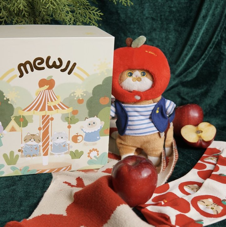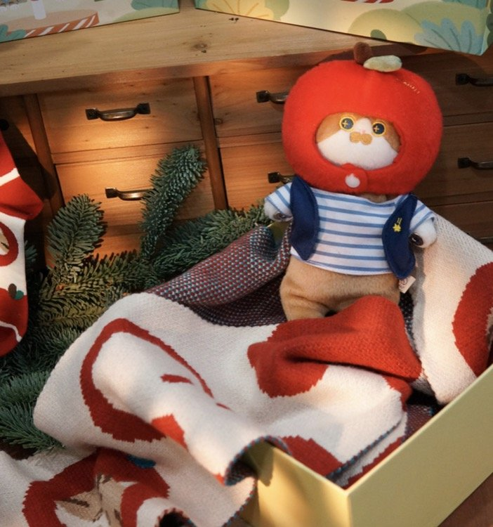 一个戴着苹果形状头套的可爱的猫咪玩偶,再加上与之相配的苹果图案围巾和袜子,为您带来一份甜蜜的圣诞惊喜。