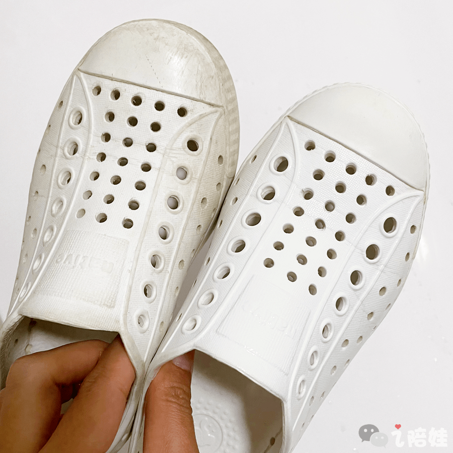 像本身就不怕水的塑料材质,用擦鞋巾和免洗清洁泡沫擦都好使。芊芊以前穿过的洞洞鞋穿得已经挺脏的了,也能擦出原本的白模样来。