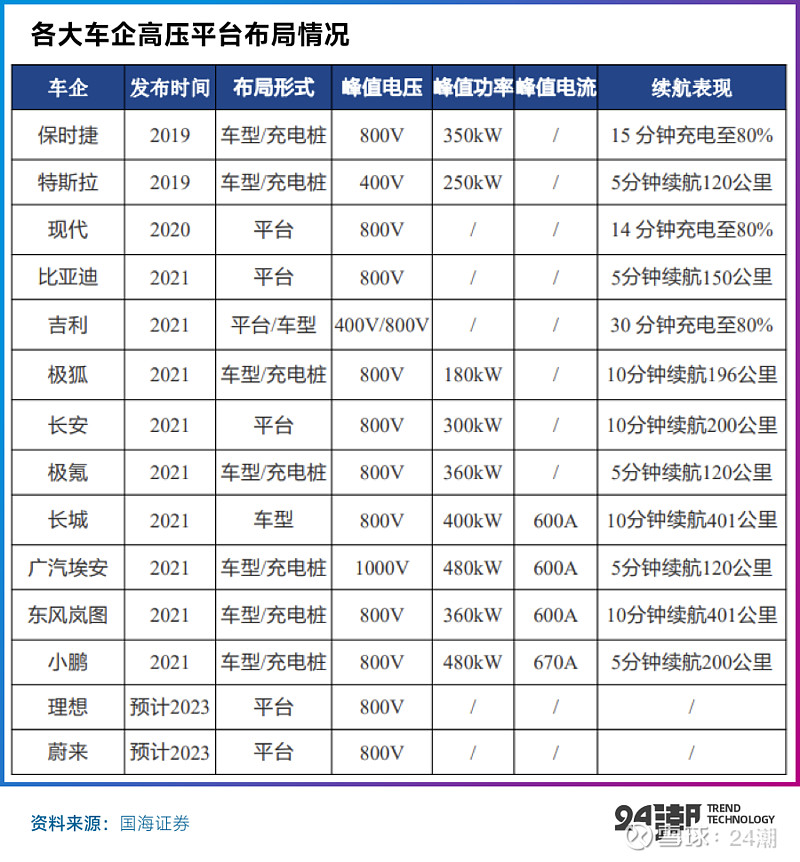 自保时捷Taycan全球首次推出800V高电压电气架构以来,2021年,国内外车企掀起一轮800V电压平台车型发布潮,以图抢占大功率快充新高地。