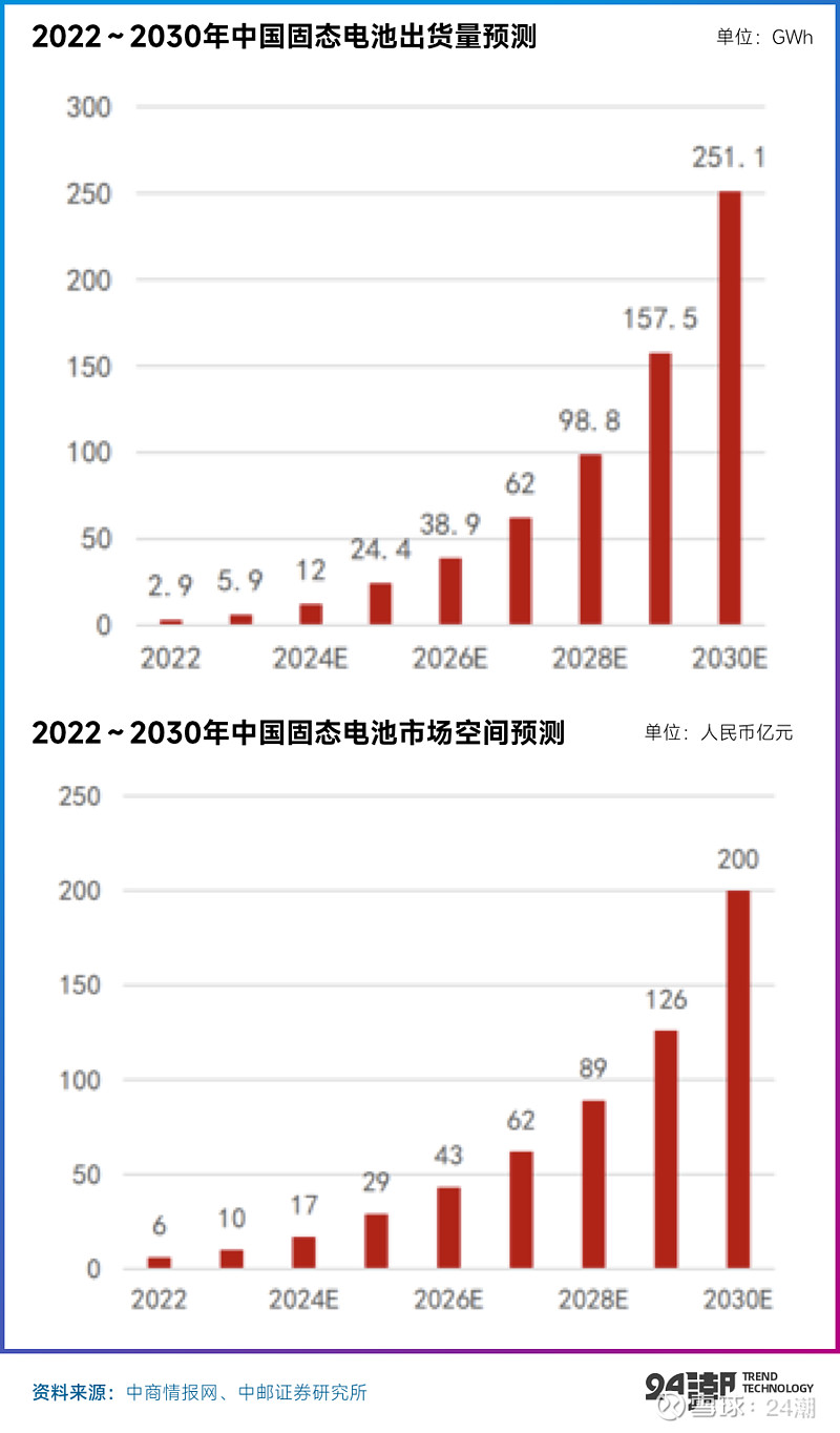 而中邮证券也认为,固态电池当前处于起步阶段,产业化仍需时间。其预计 “2030年中国固态电池出货量将达251.1GWh,2030年市场空间有望达200亿元。”