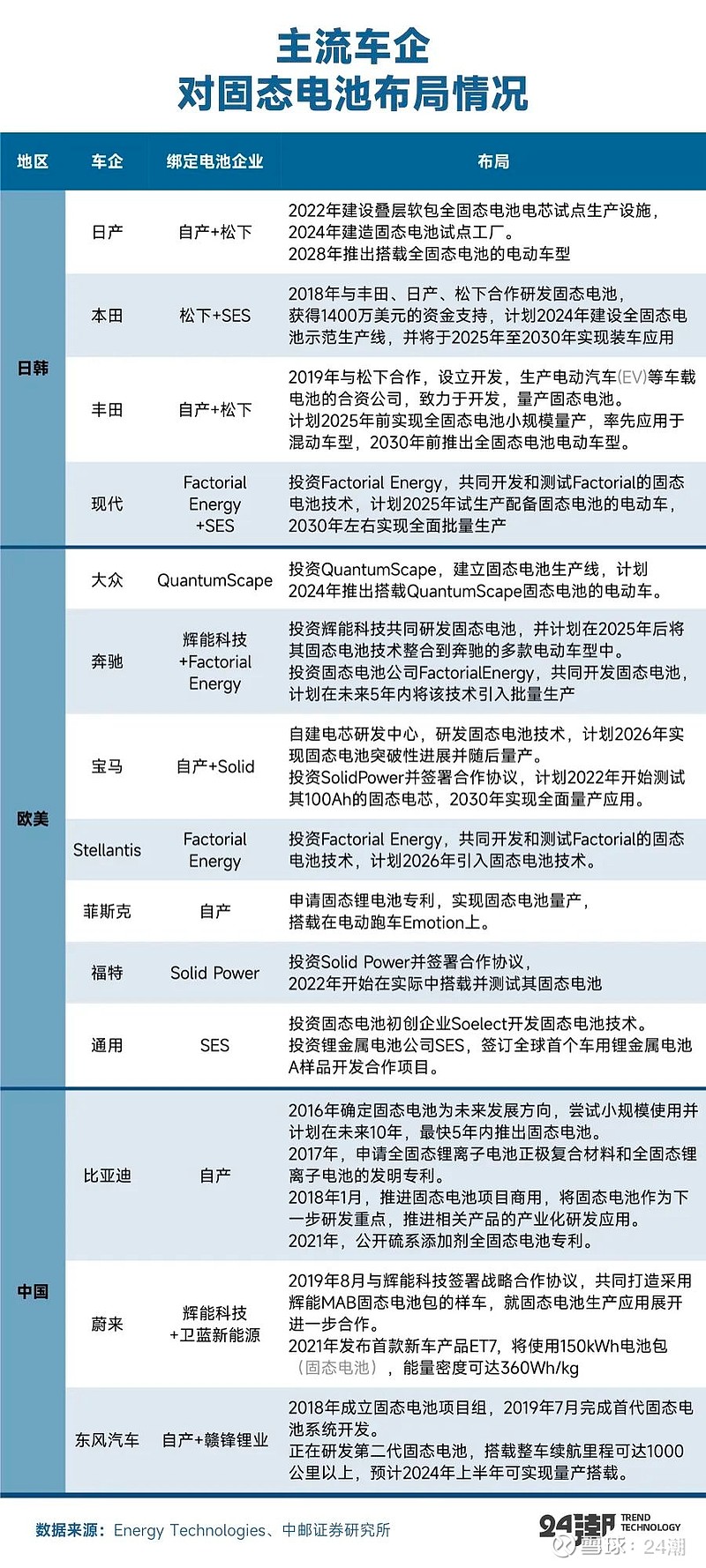 事实上,为了抢占下一代电池技术风口,很多车企通过绑定电池厂,提前布局固态电池技术,而车企入局为固态电池企业提供了资金、技术、客户等多重保障,有助于推进固态电池商业化进程。