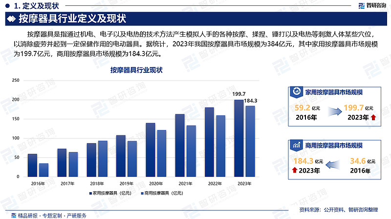 近年来,随着科学技术的不断发展,按摩器具行业已发展成为集机械电子技术、计算机技术、伺服控制技术、传感技术、机器人控制技术以及新材料技术于一体的多学科交叉、知识密集、资金密集的高技术产业,其涉及的行业有机械、电子、医疗、纺织、皮革、化工、家具等众多相关领域。据统计,2023年我国按摩器具市场规模为384亿元,其中家用按摩器具市场规模为199.7亿元,商用按摩器具市场规模为184.3亿元。