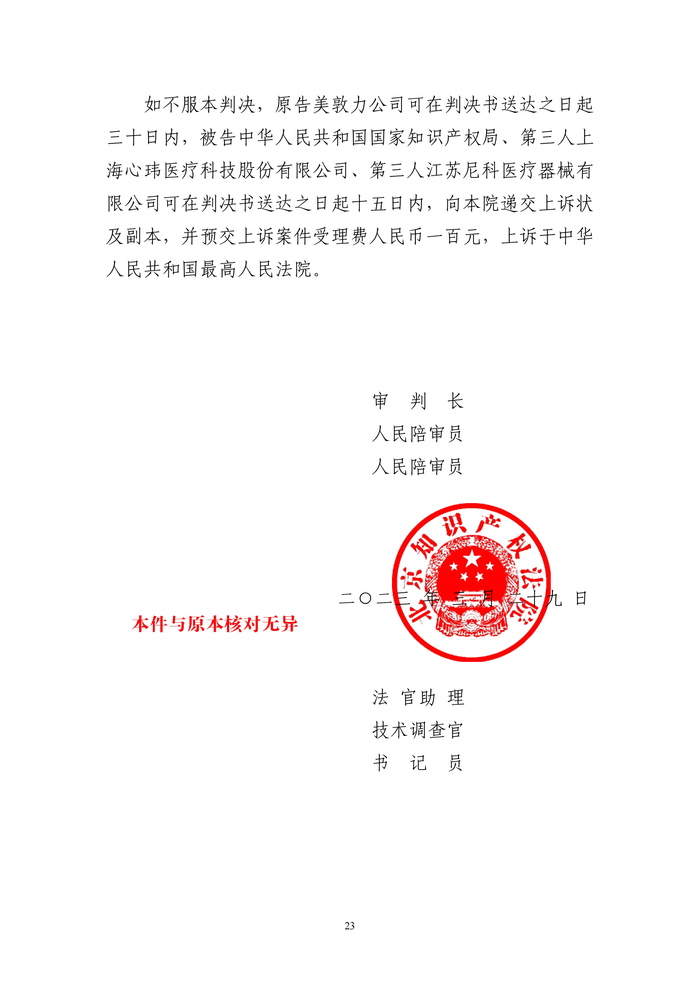 近日,由北京三聚阳光知识产权代理有限公司、北京易聚律师事务所联合代理江苏尼科医疗器械有限公司的专利无效诉讼一审结案。北京知识产权法院作出(2022)京73行初13741号行政判决,驳回美敦力公司针对国家知识产权局第55824号无效宣告决定的诉讼请求。
