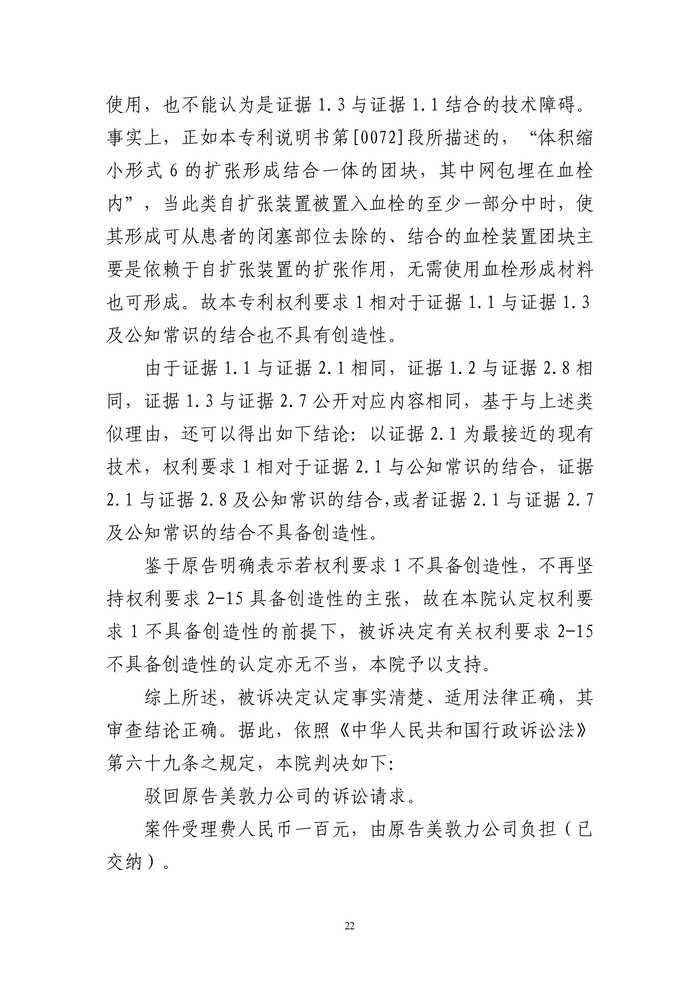 证据1.1已经公开了该专利权利要求1中的全部结构特征。只是未明确记载技术特征A.“自扩张装置是用于去除血管中血栓的”和技术特征B.“所述网结构的所述远端被配置为植入于所述血栓的至少一部分中,从而形成可从患者结的闭塞部位去除的、结合的血栓装置团块”。