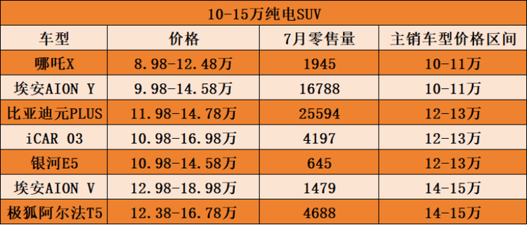 8月初,随着吉利 银河E5(参数|询价)的上市,在紧凑级纯电SUV市场掀起了惊涛骇浪,让一众对手都与之较量,那么除了银河E5之外,在10-15万级纯电SUV还有哪些值得推荐的车型?下面我们选取了目前市场上实力最强的7款车型来进行分析,如下图。