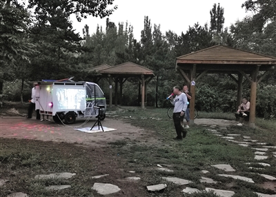 7月28日晚7点半,记者来到常营公园,刚进南门,就听到鼓点强劲的音乐声。记者循声前往,看到西侧草坪上放着一个大音响,两位游客正热情高涨地唱歌。一块幕布挂在三轮车上,投屏、灯球、点歌器一应俱全,俨然一个露天卡拉OK现场。一位大姐介绍,唱歌只需2元一首。