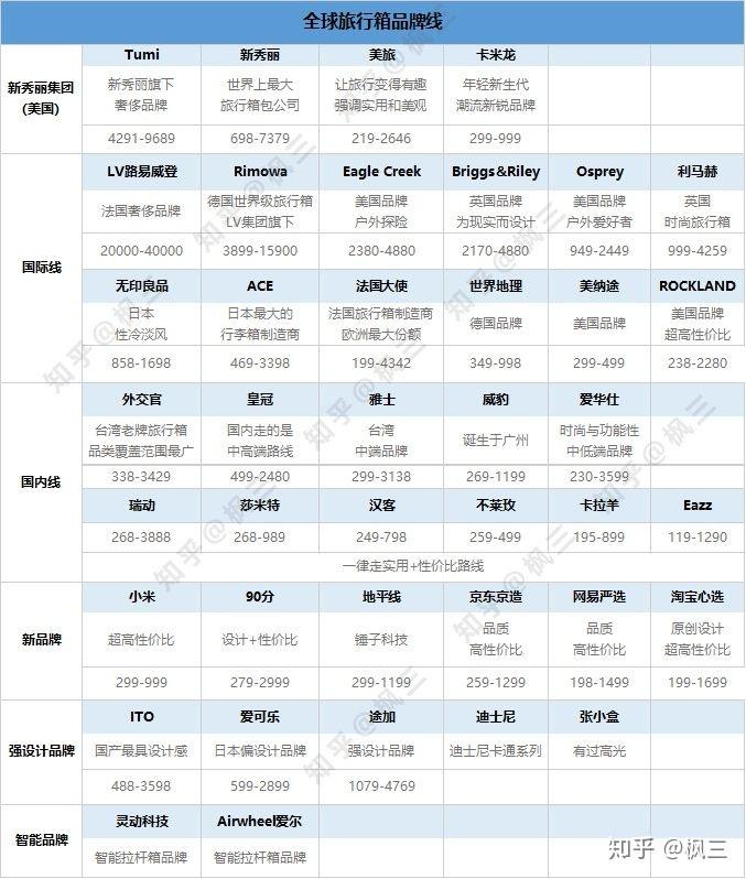 全球品牌行李箱品牌线京东热销品牌排行榜天猫热销品牌排行榜京东热销前100名好评榜全球品牌行李箱品牌线当初做这张表的初衷就是方便了解各个行李箱品牌的定位和区别。