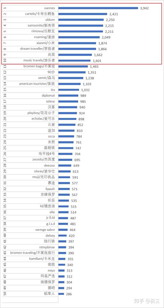 oannescartelo/卡帝乐鳄鱼uldumsamsonite/新秀丽rimowa/日默瓦roaming/漫游xiaomi/小米dream treller/梦旅者尚层music trels/游乐者天猫TOP50品牌完整数据排行榜