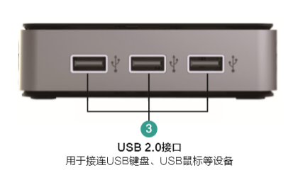 4 个 USB 2.0 标准接口 • 支持 USB 键盘 • 支持 USB 鼠标 • 支持 USB 存储、USB 打印机等 USB 接口设备