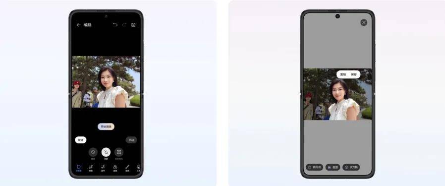 记者还测试了nova Flip的AI消除和AI智慧抠图功能,它能智能消除某一照片中的路人、杂物,生成式补充图片内容。当记者任意拍摄手机台上的局部图片后,点击相应的功能便实现扩图,整体无违和感。