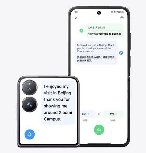 记者注意到“小爱翻译”这个App已经是MIX Flip的预装应用,也是AI功能的亮点之一,这款App能够实现实时字幕、屏幕翻译、拍照翻译、同声传译功能。当一个说英语的人讲话时,页面会快速翻译成对应的中文,从而让交流更加顺畅。