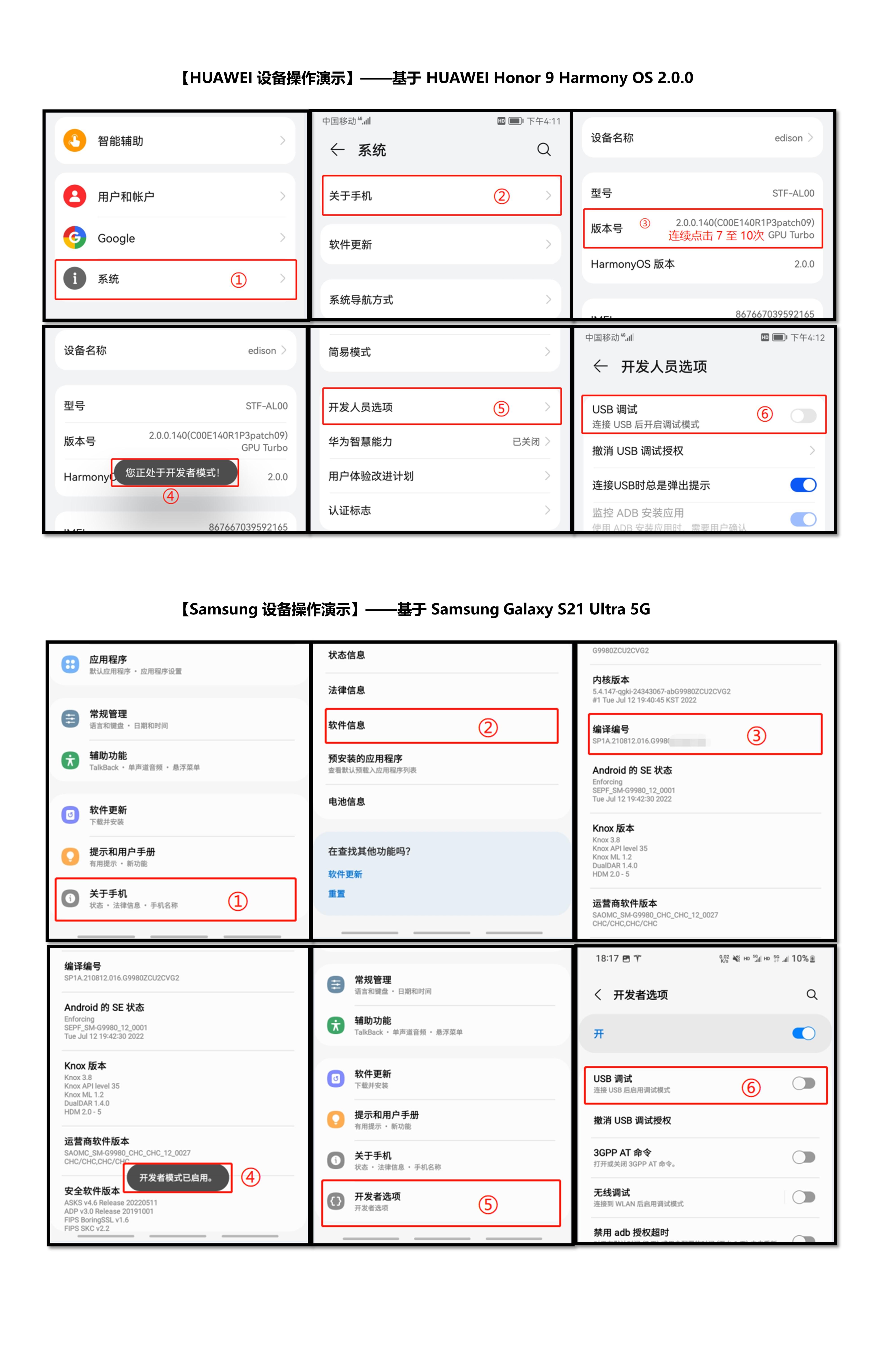 4、如为 Android 设备,请在手机中打开 USB 调试功能;下面以华为、三星举例: