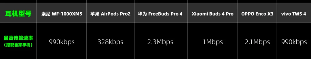 而之前耳机上常见的那些无线传输协议,比如 LDAC、LHDC 这些,它们实际传输码率也就在 900 Kbps 左右,如果换成更基础的 AAC 或者 SBC,传输码率就更低。