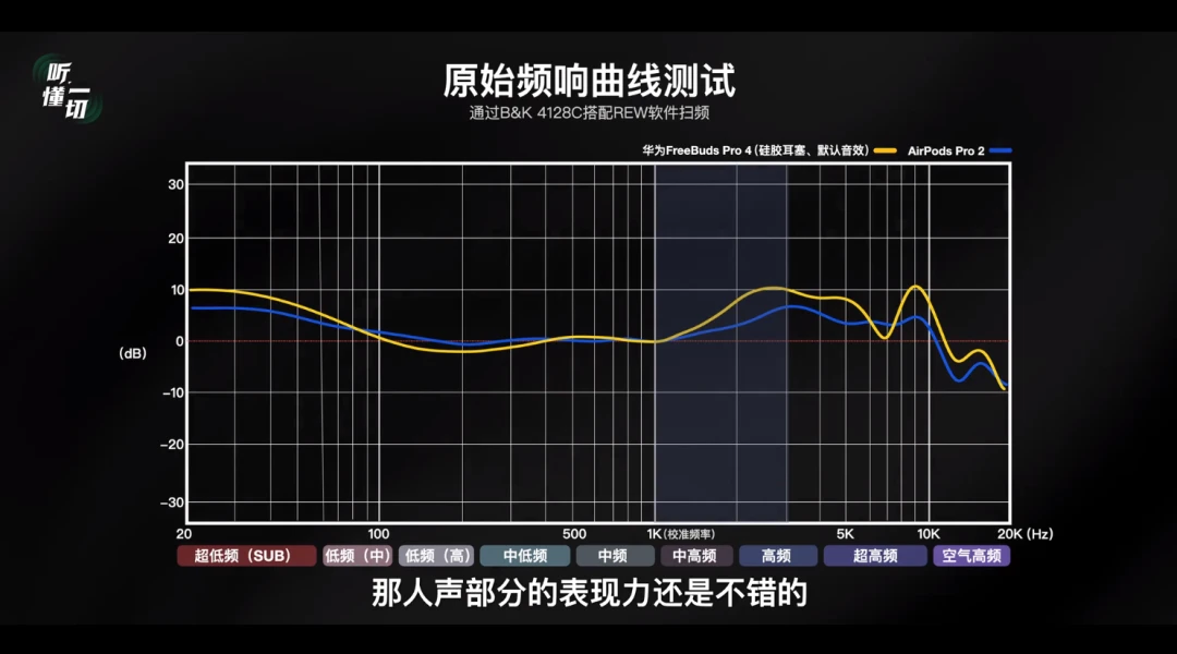 从 B 站 UP 主 “ LIKEMUSIC ” 测得的频响曲线我们可以看到,FreeBuds Pro 4 相比起 AirPods Pro 2,在低频、中高频和超高频的表现都比较突出,声音饱满而且细节丰富。