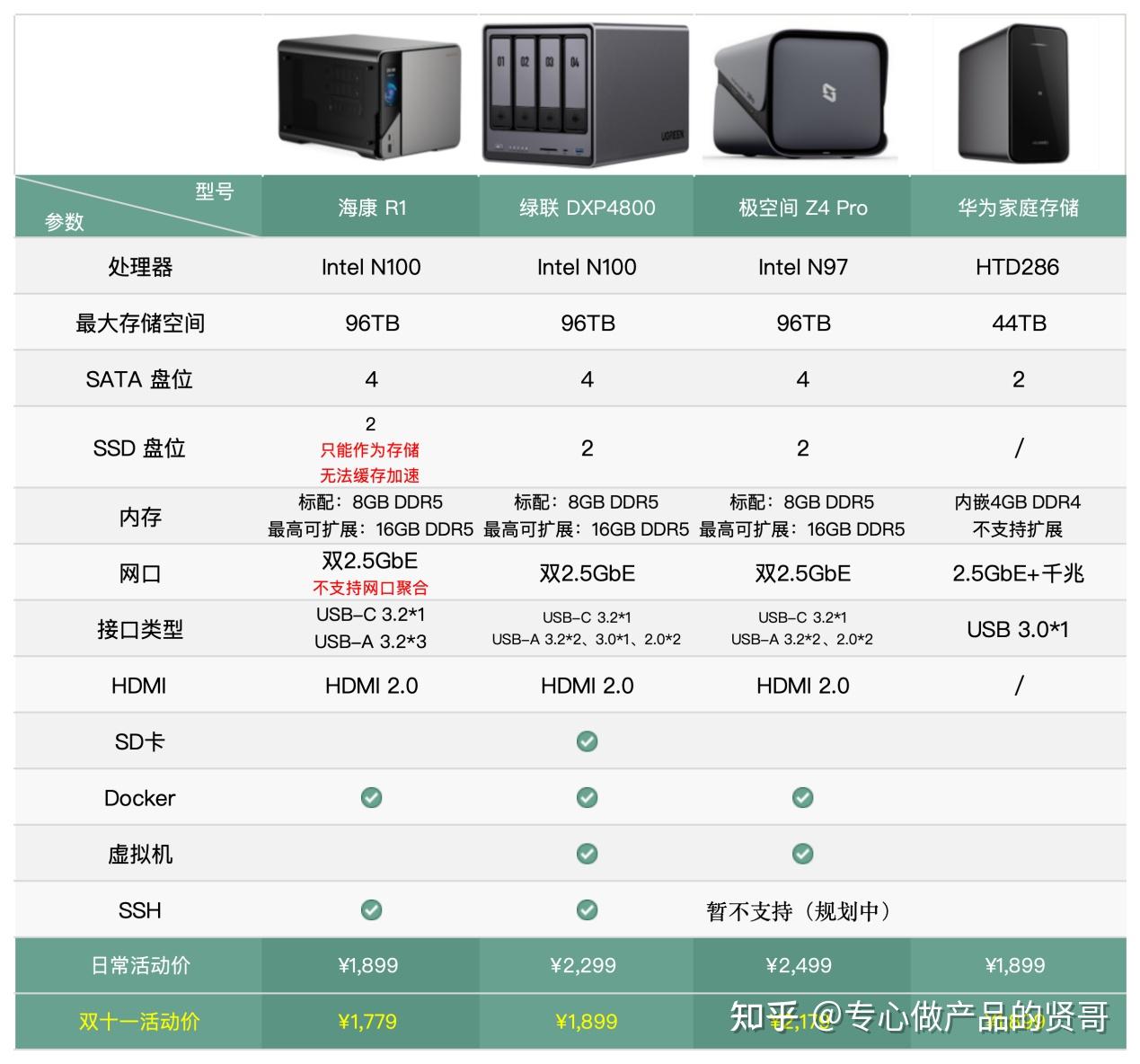 https://xg.zhihu.com/plugin/2cfae4764e49f75835ef01558a2abb52?BIZ=ECOMMERCE极空间Z4 Pro极空间Z4 Pro也是一款不错的家用NAS,在硬件配置方面与绿联DXP4800相差无几,虽然处理器型号不同,但性能不相上下,主要区别在于Z4 Pro使用的Intel N97处理器功耗比N100高,不支持读取SD卡。