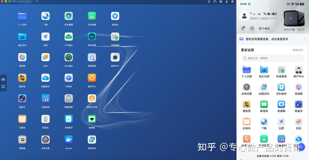 Z4 Pro搭载了极空间自研的面向家庭、个人使用的ZOS系统,该系统在影音娱乐、文件管理方面有着不俗的表现。ZOS内置的影院功能。“极影视”利用智能语义分析算法,可自动匹配精美海报墙,自动识别和整理影视资源信息。系统还支持按文件名、大小、格式等属性进行智能分类和标签化,蓝光、4K、HDR等视频特性均可自动识别展示,方便用户轻松实现一目了然、一步到位的影视管理。很适合NAS小白拿来搭建家庭影院。