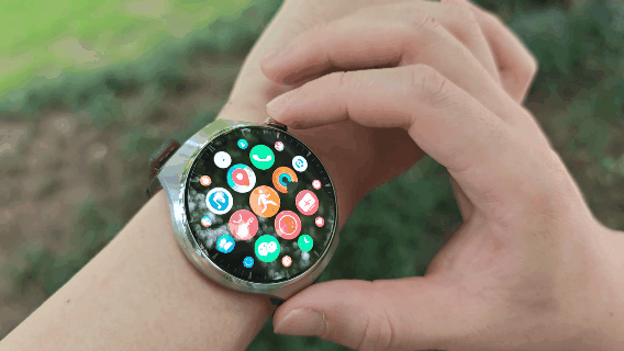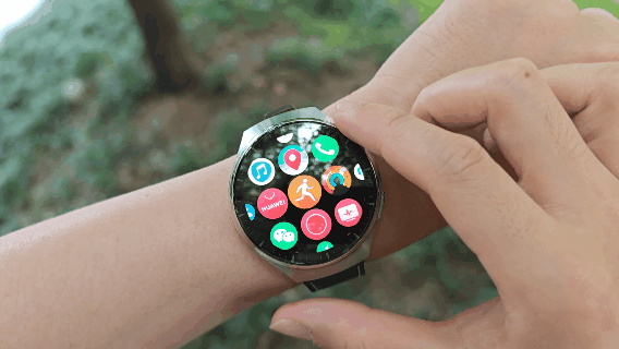 先看一下功能界面,这次依然是旋转表冠+棋盘式界面布局,但是扭动起来就会发现界面的动画有了变化,和Apple watch类似,中间的图标大,边缘的图标小,看起来更灵动更流畅。
