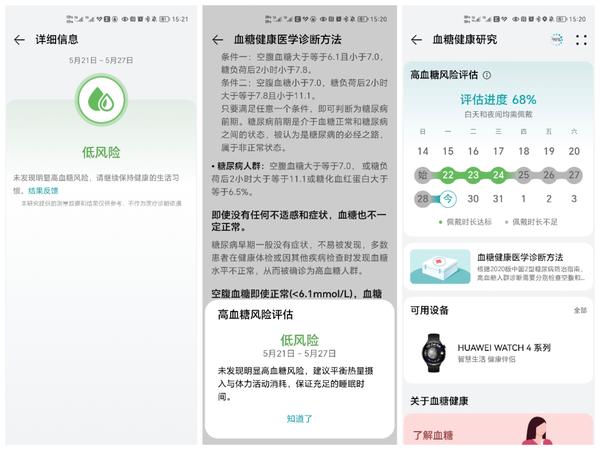 先说高血糖风险评估,华为 WATCH 4 星球系列基于华为 TruSeenTM5.0 + 监测技术,通过周期性佩戴,集成白天和夜间不同状态下的生命体征监测数据,最终根据持续 7 天以上连续佩戴,可实现高血糖风险评估,并根据风险等级给测试者提供建议。