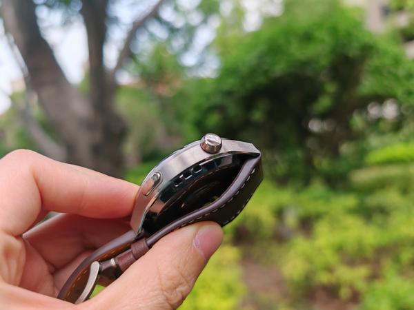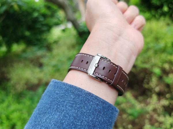 华为一贯精致的表带LOGO也没落下,我这款木星棕的表带颜色偏深,不是常规的棕色,介于棕色和和酒红色之间。