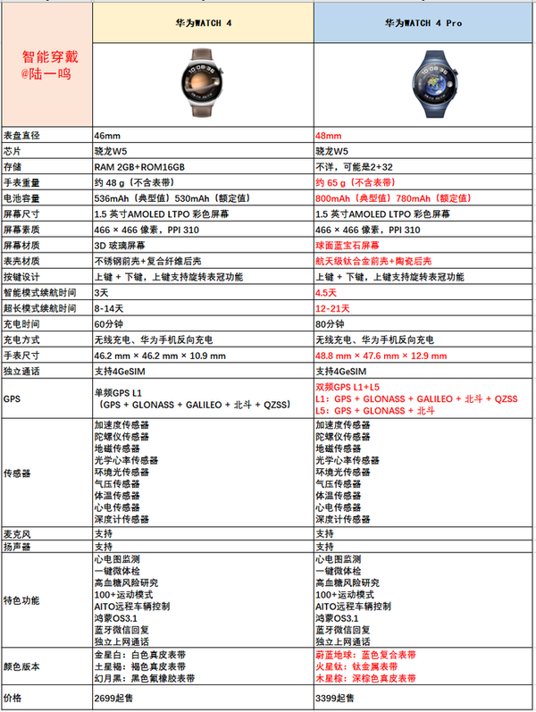 六、两者区别:华为watch4和4 Pro参数对比介绍老习惯,先看我整理的详细配置参数对比表(原创不易,对你有用请关注点赞 @陆一鸣 支持一下~)