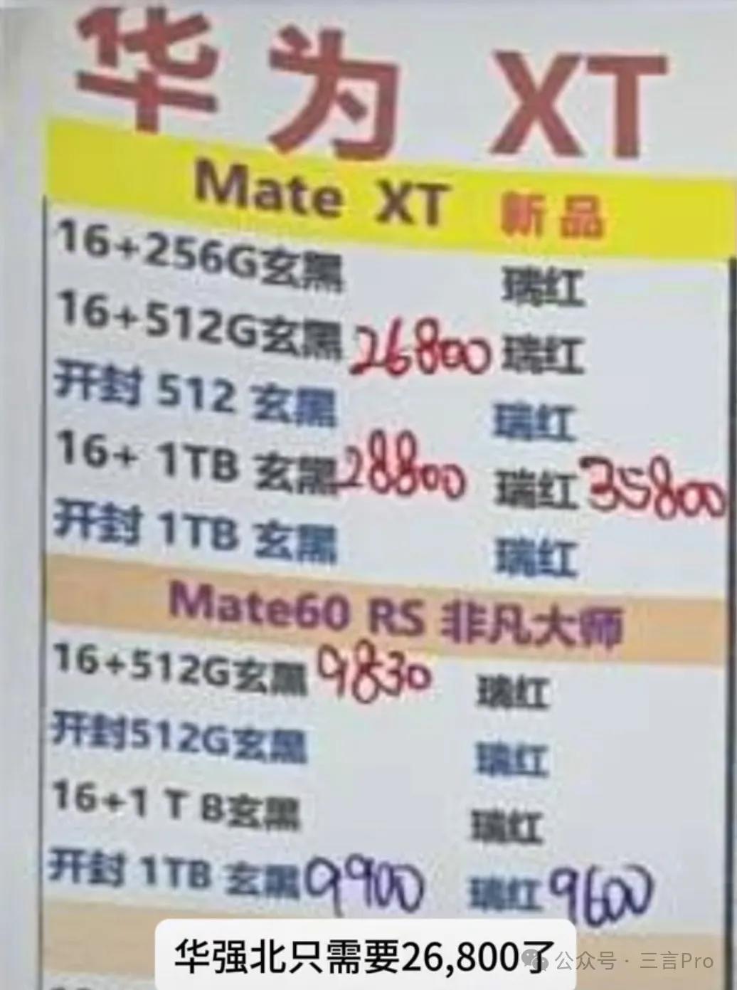 一位在深圳的数码博主晒出华强北Mate XT黄牛价显示,9月22日,黑色16+512G版本售价26800元;黑色16+1T版售价28800元;红色版售价35800元。对比官网价格,分别加价4900元、4801元和11801元。