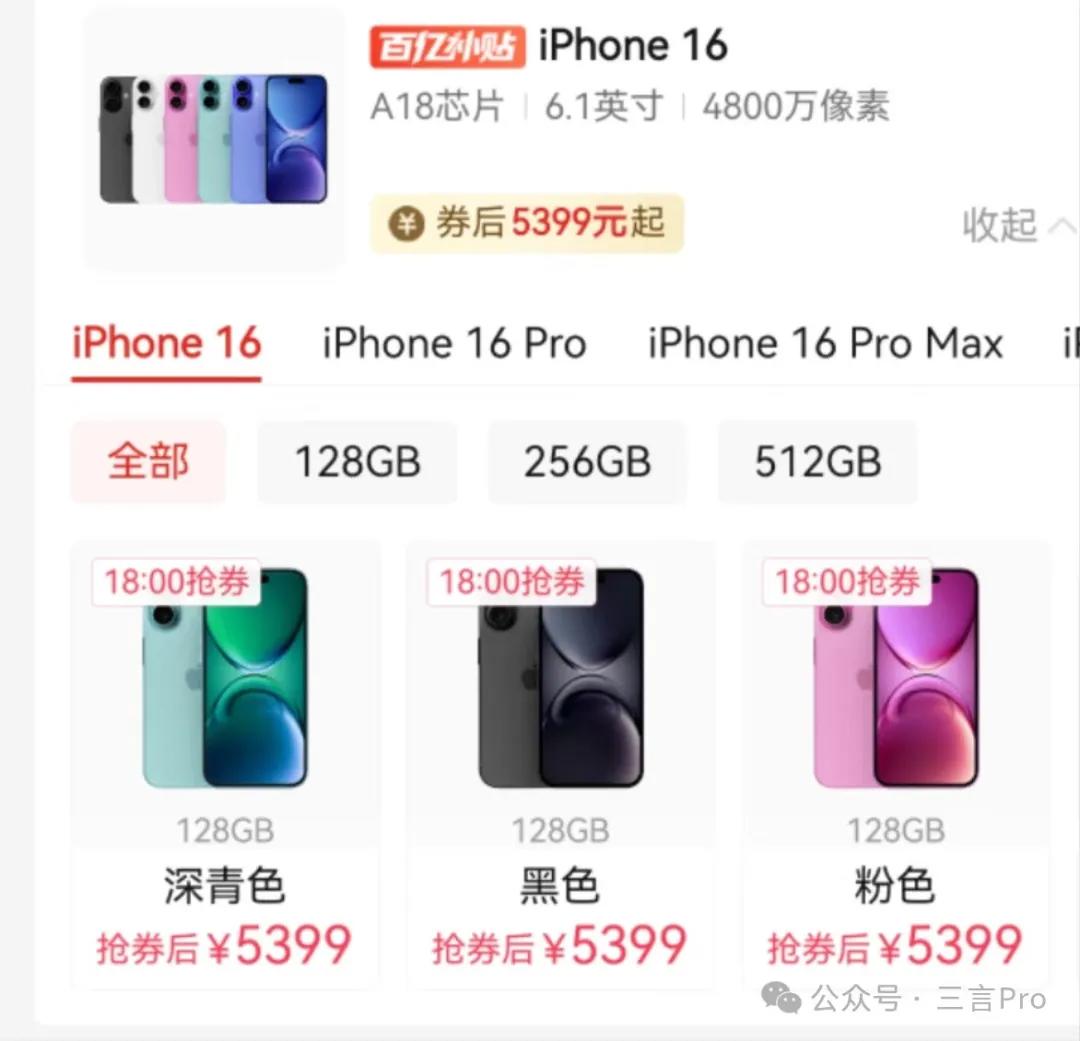 iPhone 16官网价格5999元起,而第三方平台在9月20日新iPhone上市之前补贴价就已经5399元起,直降600元;