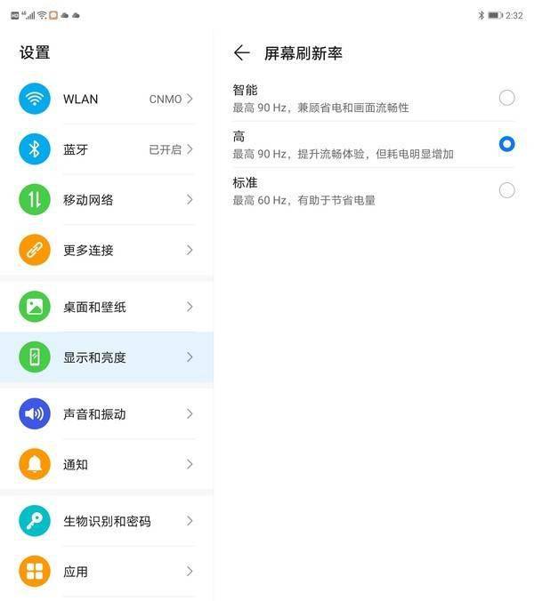别看Mate X2有两块屏幕,但它的屏幕刷新率是统一设置的,要么全是“智能”,要么全是“高”,或者“标准”,保证了使用外屏和内屏时体验的统一。