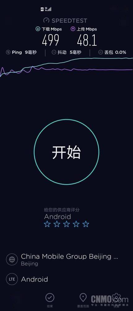得益于麒麟9000的强大5G能力,华为Mate X2表现出色,我们用测速软件在室外环境使进行了测试。华为Mate X2可以轻松跑出499Mbps的下行速率和48.1Mbps的上行速率,Ping值为9毫秒,抖动为5毫秒。