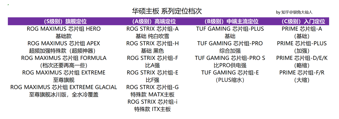 华硕:三大家之首,毋庸置疑的主板第一品牌,品质、做工、bios调教都是一流,旗下还有ROG,败家之眼这个信仰加成,旗下产品系列定位档次,如下表: