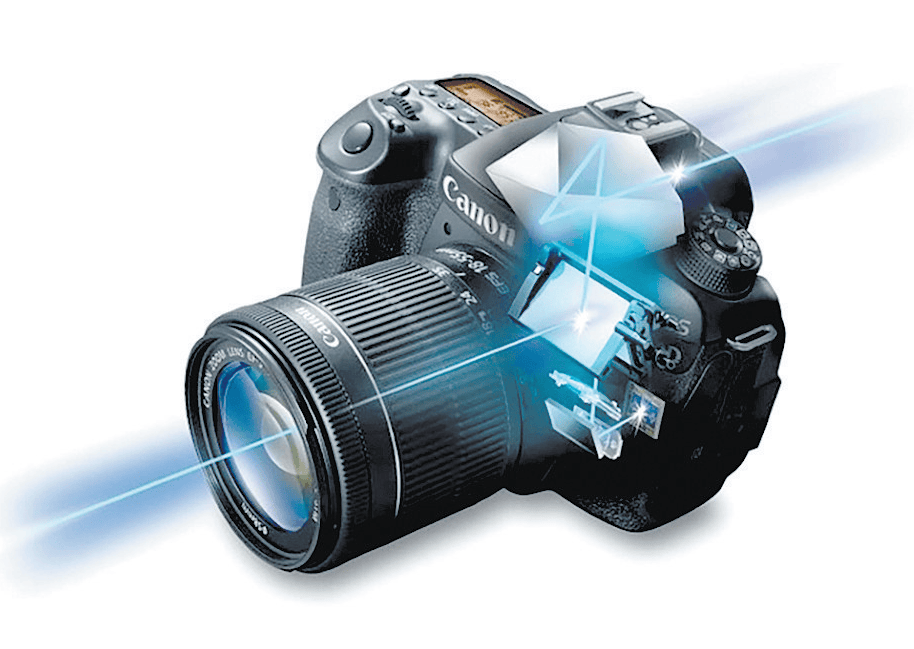 数码单反相机光路的剖面图,光线进入镜头并反射到取景器以及相机的自动对焦模块。数码单反相机中的光学取景器使用镜子系统来反射从镜头到取景器的光线。一些光线也(通过副镜)反射到相机的专用自动对焦模块中。