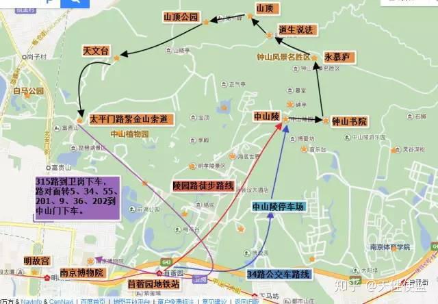 ◆然后可以去爬紫金山,沿着钟山书院到永慕庐那条路走,再往西“道声说法”可以到紫金山山顶。再沿着山顶公园(有索道可直接下山)——天文台——紫金山索道下山。在紫金山索道处可移转下图公交到南京博物院。路线倒过来走也可以。
