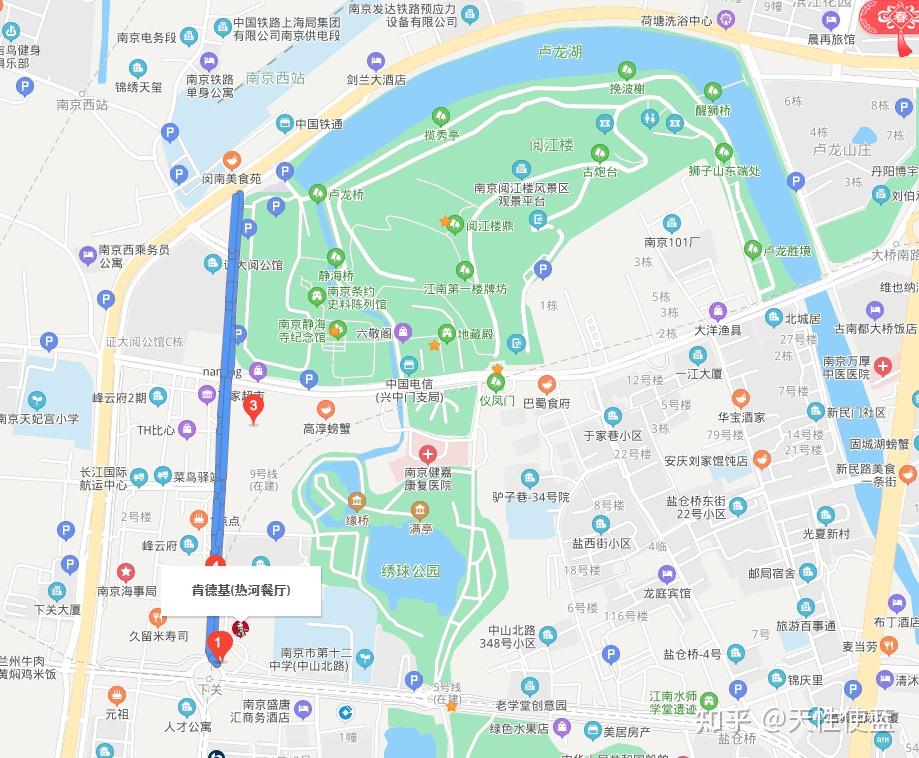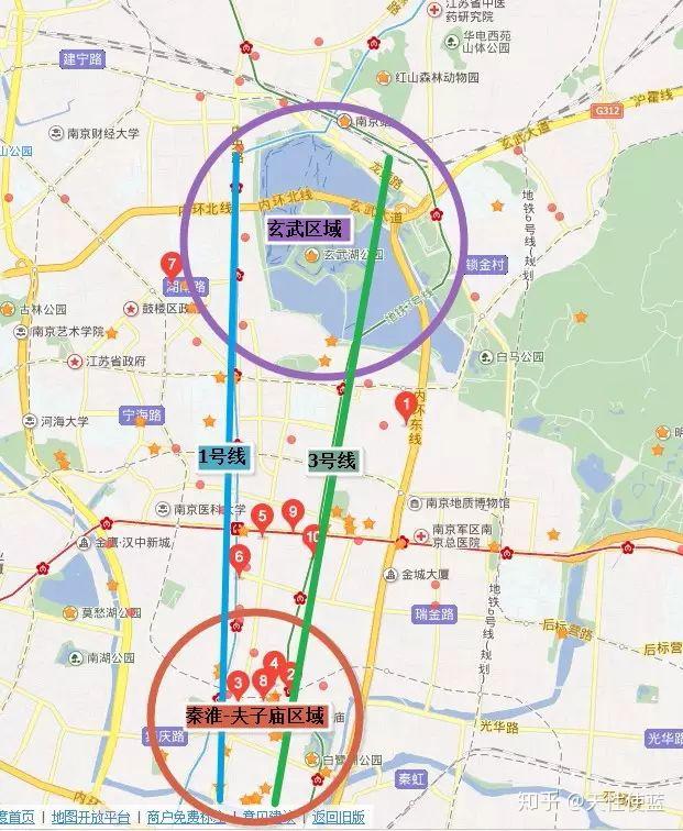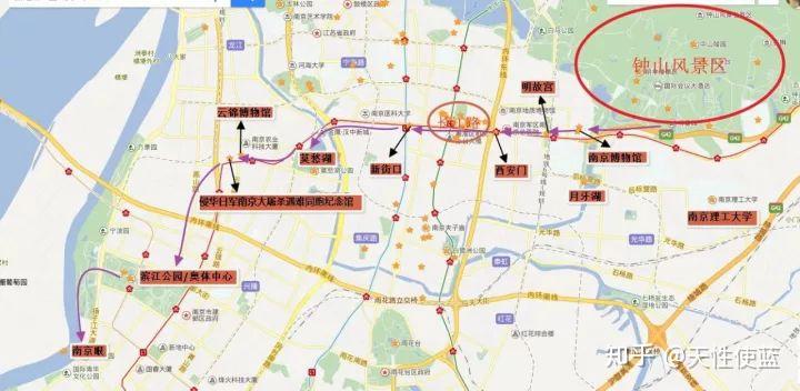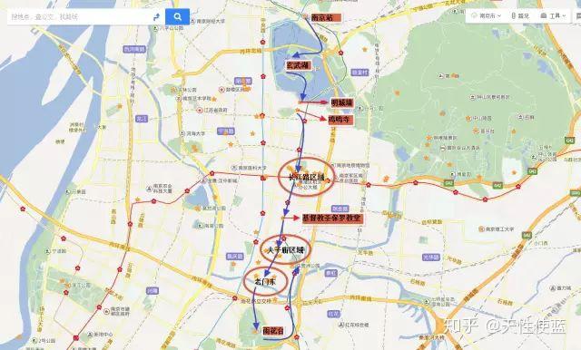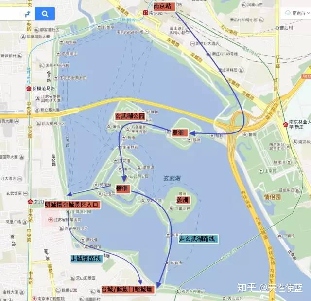 ①南京站(免费)南京站也是南京四十八景之一,叫做“站映湖光”。因为南京站就在玄武湖边上。南京站是中国十大火车站之一,有“中国最美火车站”之称,也是中国唯一临湖依山的火车站。 我把南京站选为起点,是考虑到南京站的卧铺车比较多。大家可以乘坐晚上的卧铺,第二天早上到南京。如果你行李只有一个背包,住宿就在我推荐的区域。这条路线玩下来,你在中途去一下酒店放东西即可。假设早上7点左右到达南京站。②玄武湖(免费)四十八景“玄武烟柳”即为此处。玄武湖是江南最大的城内公园,也是我国最大的城市园林湖泊——玄武湖原本是皇家园林。。。的一部分。。。。玄武湖名称有很多,古时也称后湖、北湖。湖内又分环洲、翠洲、菱洲、梁洲、樱洲,彼此相连,风景十分秀美。清晨有很多人晨练,晚上夜景也不错。玄武湖如同杭州西湖,也分十景, 分别为:五洲春晓、侣园馨风,莲湖晚唱、台城烟柳,古塔斜阳、九华朝晖,鸡鸣晚钟、西堤秋月,月湖笙歌、古墙明镜。这里不再多做展开,只给大家介绍一下我们的路线:从南京站出来以后,就是玄武湖,往左走。然后按照下图的路线游玩。参考时间:1-2小时左右。