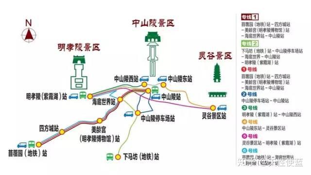 钟山风景区交通图2)钟山景区主要由明孝陵、中山陵、灵谷寺三大区域组成。附近景点有紫金山、白马公园等。 虽然分区域,但是彼此相连,景区间也有景区观光车(小火车)和旅游专线相连。旅游专线是2元,而小火车和电瓶车则是10元/次。路线见上图。