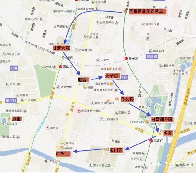 第一天下午方案一(普通游推荐):秦淮河风光带深度游(四十八景之一“十里秦淮”),这条路线适合不去雨花台, 一下午和一晚上都泡在这个区域 的朋友。可以按照下图的路线,游玩夫子庙区域。这条路线中,甘家大院、瞻园、愚园、中华门都是要门票的景点。大家根据预算来。预算少的朋友,可以直接坐车到夫子庙,然后游玩夫子庙——乌衣巷——白鹭洲——水街——老门东——(大报恩寺,备选)——(晨光1865创意产业园,备选)。(夫子庙那边还有个桃叶渡,也可以去逛逛,这里就不写了。)