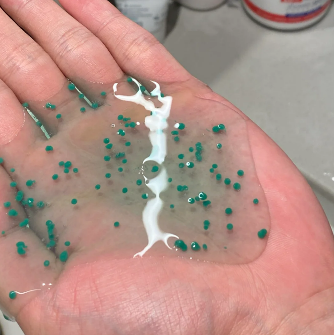 她每次用的时候都会把它放在头皮上按摩1-2分钟,里面是绿色的颗粒,查了下说是按摩会被头皮吸收