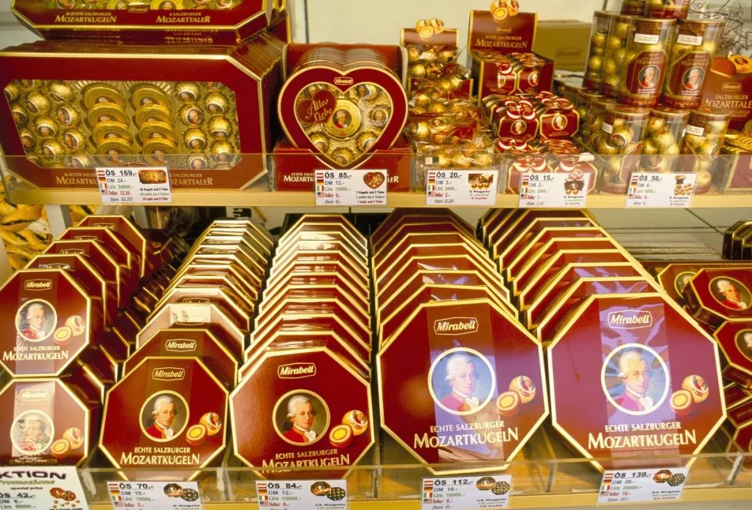 ▲莫扎特巧克力是奥地利一种传统的巧克力制作工艺,只在萨尔茨堡生产。巧克力球的最外层是口感柔软的优质巧克力,而中间层是充满着浓浓牛奶口味的太妃糖,而中间部分则是松软的开心果和杏仁口味的馅料。这口感,你吃了就知道了。