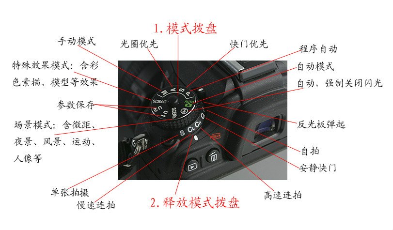 1. 模式拨盘 用于选择拍摄模式。操作方法:按住中心按钮同时转动拨盘至所需模式。