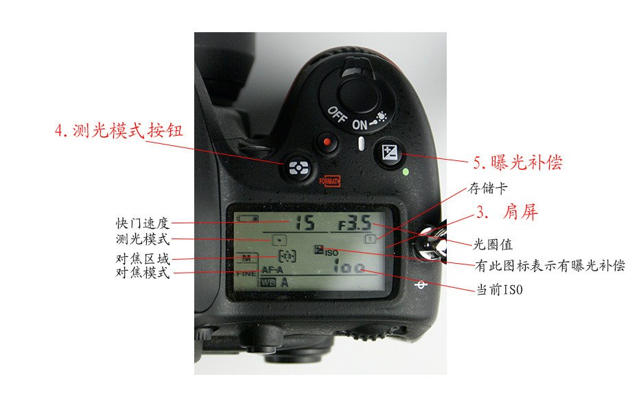 12. -ISO 缩小观看照片;ISO设定。按住该键同时转动主拨盘,肩屏可以看到ISO数值,调整起来很方便。