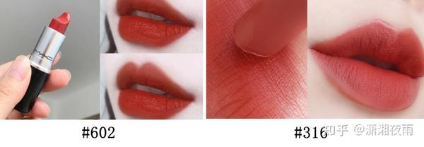 https://xg.zhihu.com/plugin/bd51502e0c7b791e716de2ef955b0a1c?BIZ=ECOMMERCE经典子弹头推荐602,是mac的爆款色号,质地柔美哑光,上色效果特别好。涂上嘴很衬托肤色,滋润效果也挺不错的,不会拔干。色号一眼看去是红色,但棕调比较明显,还有点铁锈红的感觉,颜色很适合日常,素颜裸妆都非常合适,完全不挑肤色。
