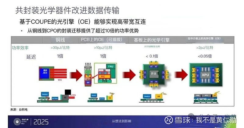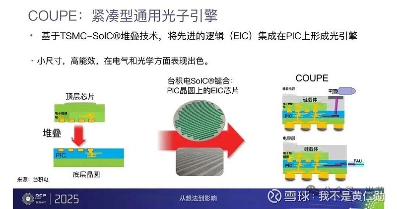 为Coupe引擎而生的双面晶圆测试设备:产能不是瓶颈,上量只是时间问题当前,台积电在硅光领域开发的 Coupe 引擎,是 CPO(共封装光学)、OIO(Optical I/O)领域的关键底层通用技术。 Coupe 平台从研发之初就瞄准了未来超大数据带宽的迭代需求,采用了光芯片与电芯片上下堆叠封装工艺,从而可以实现:
