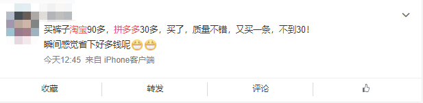 其实,拼多多东西比淘宝便宜,很多人都明白这个道理。许多网友也深有体会,有人直言,拼多多买的5升菜油比超市还便宜不少;同一条裤子,淘宝要90多元,拼多多30多元,拼多多下单,瞬间感觉省了好多钱。