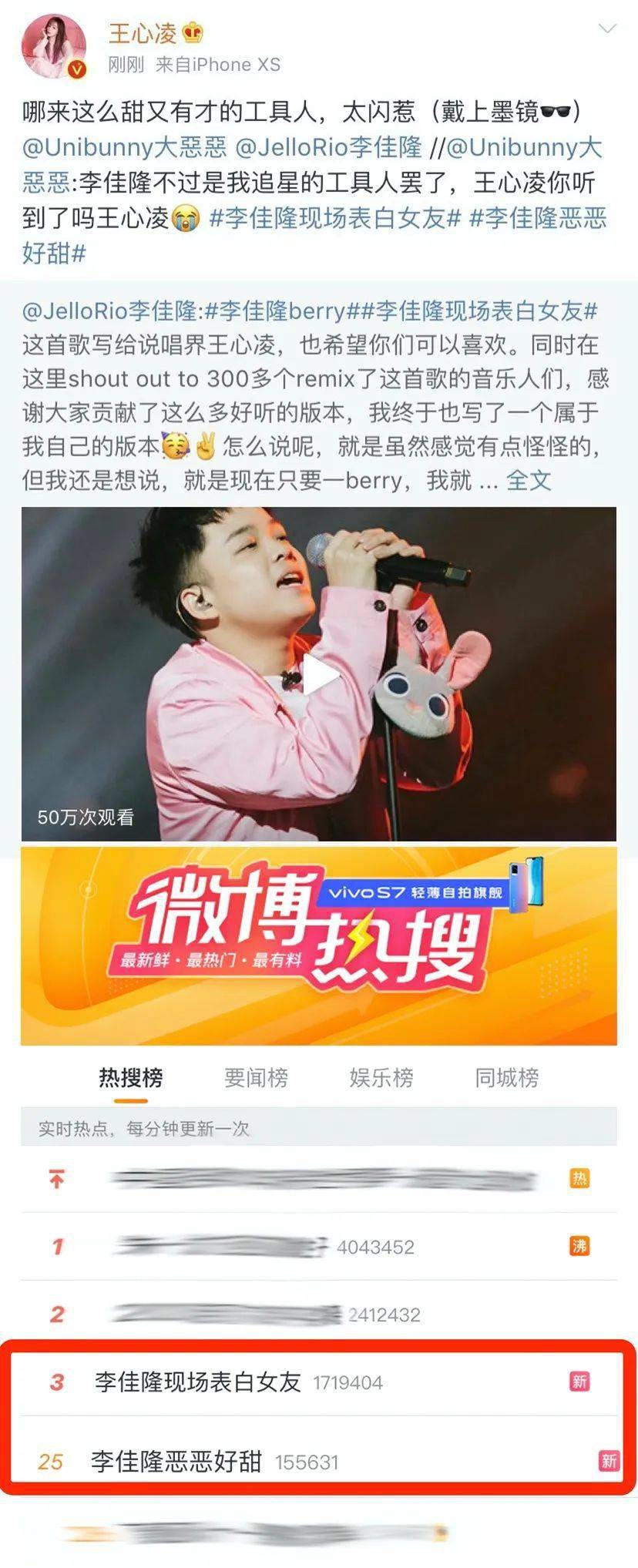 李佳隆在节目中创作出了属于自己和女友的全新版本,因为歌曲好听加上情感真挚,所以节目播出后,微博顺利登上热搜第三,并且双热搜,还引来了歌词中提到的 “王心凌 ”的互动。