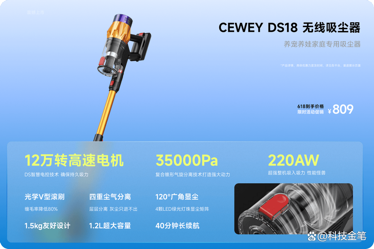 在硬件配置上,DS18搭载12万转高速无刷电机,220AW强劲吸力+35KPa真空度,配合复合锥形气旋结构,不仅能做到持续强劲吸力,还能有效避免堵塞,长时间用下来依然顺畅。