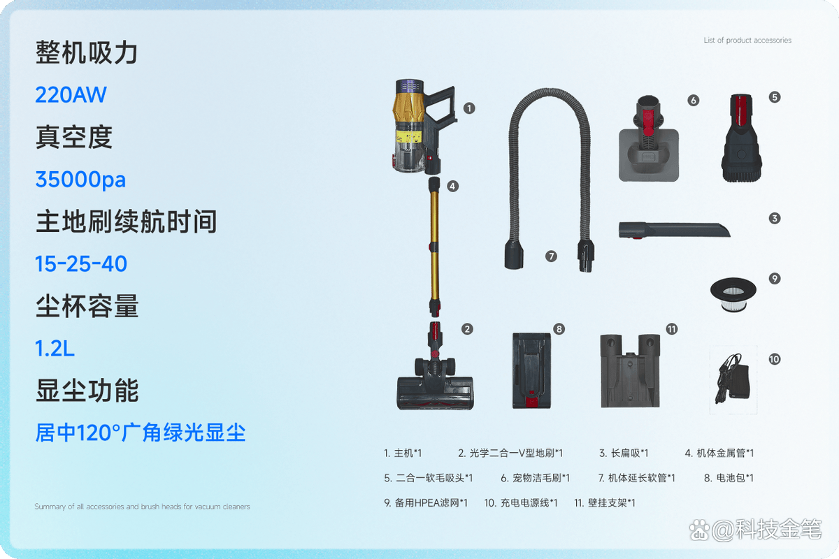 推荐理由:美的一直主打综合家电路线,这款Q9S前端配了绿光显尘灯,暗处灰尘一下就能看得更清楚,清洁更有针对性,少漏扫。刷头设计也比较灵活,打扫沙发底、墙角这些地方转动起来很轻松,不用费力去摆角度。吸力表现稳定,续航时间够日常使用,刷头拆装也方便,整体更适合那些注重品牌口碑、想要用起来省心、体验稳妥的用户。