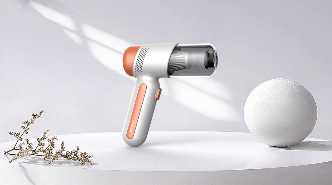 这款吸尘器设计简约而现代,以白色为主色调,搭配橙色手柄,彰显时尚感。圆形出风口与长条形风嘴结合,实现多角度调节,方便使用。手柄上的“BRAND”标识突显品牌质感,浅灰色背景凸显产品主体,整体设计轻巧且实用,非常适合现代家居使用。