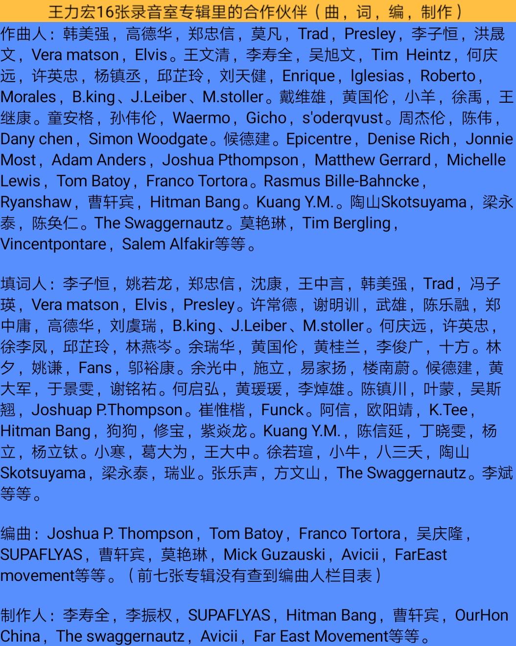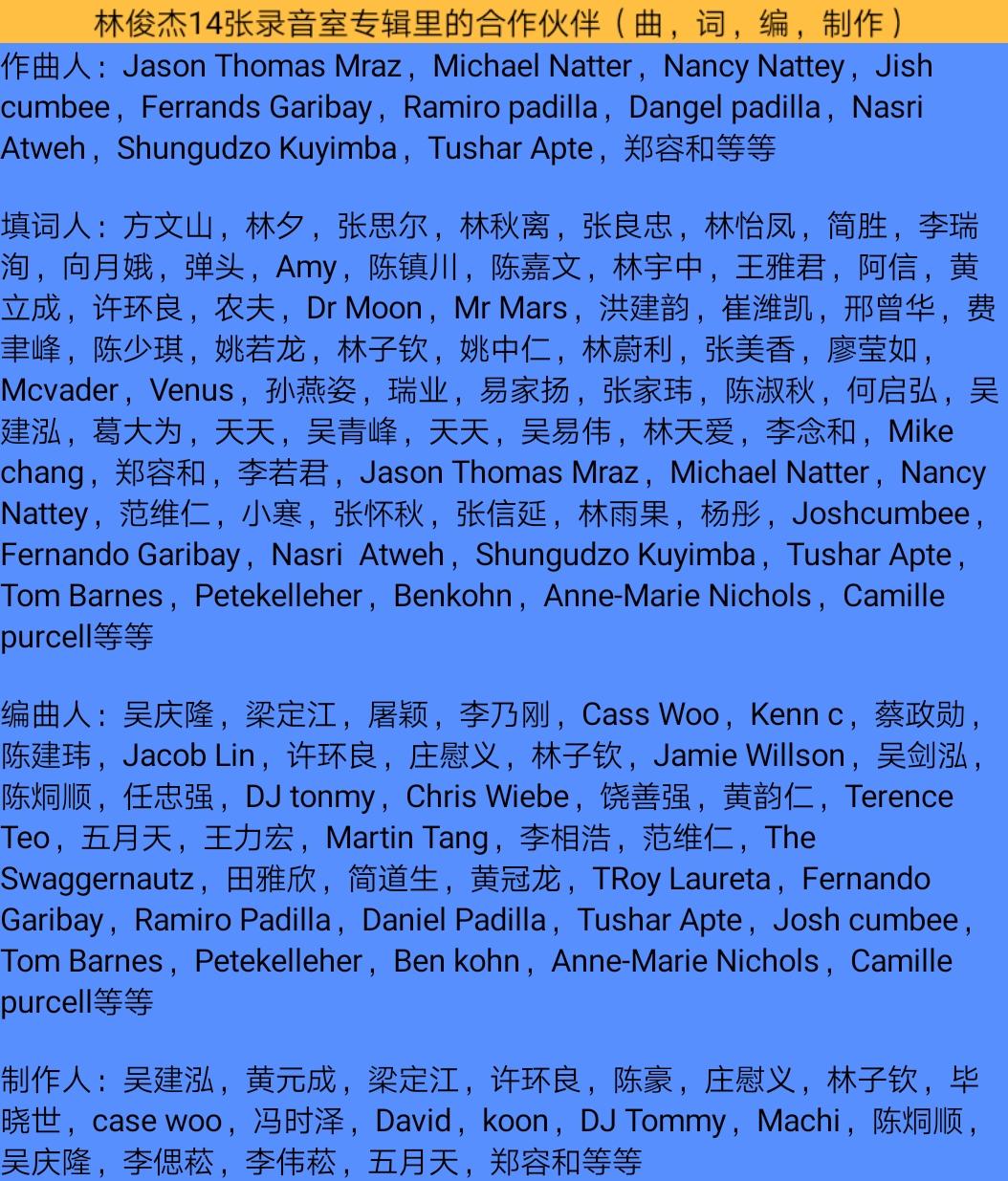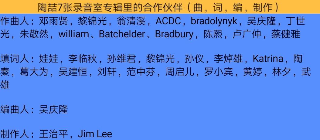 P.S.这些年因为经常在网上各个地方被碰瓷,被拉踩,本来不想在这里多说,因为稍微有点跑题。今天又看到一些反智言论,想想还是简单说几句,不然太多人真被一些洗脑包给影响了。所谓的四大创作歌手,日常捆绑提咖的“周王陶林”,看看他们各自的音乐制作团队吧。