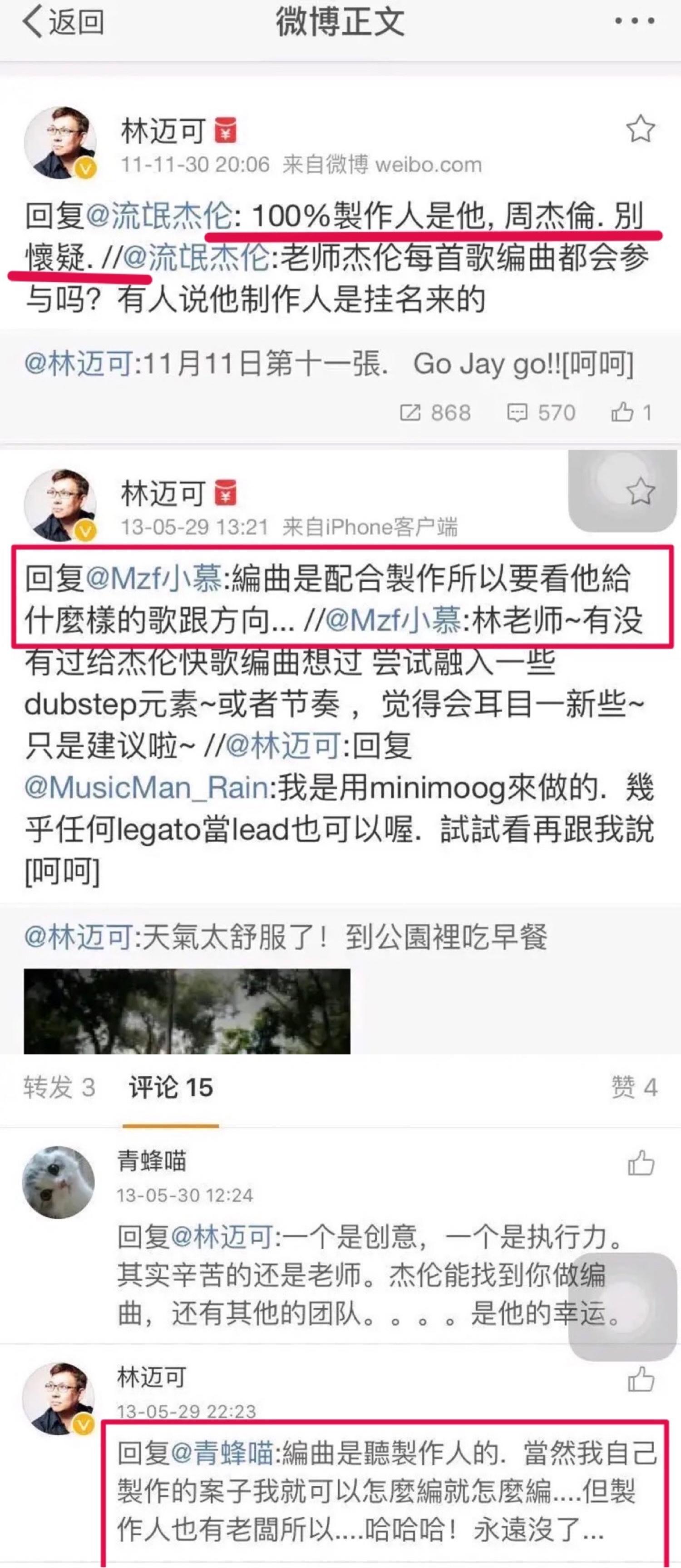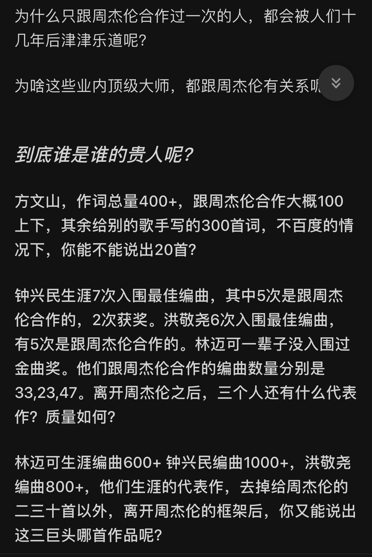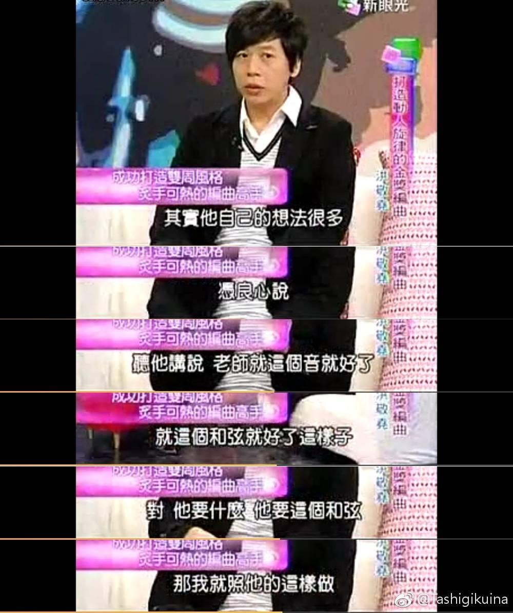 现在被跟风狗狂吹的“三巨头”。事实是,如果离了周杰伦,没几个普通听众会知道他们。如果不是洪钟林这三人跟着周杰伦,换做其他人,今天被吹捧的“三巨头”就成了刘张李,赵钱孙...等人了。跟风狗最喜欢吹的钟兴民,编过上千首歌,他们除了周杰伦听过几首?90年代给香港n多小歌手编过,跟和周杰伦的歌一对比,完全是天壤之别。所谓的什么大师弦乐毫无踪影。制作人对一首歌最终的成色起决定性作用,何况周杰伦这种音乐上大包大揽的独断性格,相当于电影的导演,然而大多数人根本不知道制作人这个角色。制作人和编曲师的关系就像盖房子,杰伦画好精细的设计图,编曲师按照图纸一砖一瓦把它盖出来。在音乐产业发达的市场,比如欧美日韩,编曲师至少会得到制作人、作曲者的一个详尽的brief,详尽到极致就是直接拿到作曲者的总谱,每一个乐器每一个音符都已经标明,只需要编曲师给出乐器的建议,甚至只需要录入MIDI,然后直接和制作人以及作曲人讨论实录环节。真正编曲工作,就是为作曲服务,挑选合适的乐器音色、配比、节奏型设计等等。而这就正是周杰伦身边洪钟林黄这些人编曲的工作,因为周杰伦本身不光是包揽所有和声编写(其实学过音乐都该知道,和声本身就是编曲的一部分),和弦进行的唯一总作曲,还身兼更为重要的制作人角色。洪敬尧上节目时多次说过他听杰伦的,杰伦说这地方用什么和弦他就用什么和弦,上mr.j时说第一张专辑杰伦就改了他的编曲。洪亲口说杰伦的歌换做其他人完全可以署名共同编曲,杰伦自己音乐洁癖不愿意。蔡科俊凭借《免费教学录影带》拿金曲奖最佳编曲时说,“拿到这个奖我要谢谢杰伦。这个编曲是杰伦和我共同研究出来的”。微博网友问林迈可怎么想到在《四面楚歌》里加一段韩语rap的,林回复说他没想到,是杰伦叫他加的,他都听杰伦的。就连钟兴民在他的编曲讲堂里回答学生提问时也说在和杰伦产生想法冲突时,都是听杰伦的,因为制作人最大。钟兴民举例说比如《七里香》他的原意是采用民乐前奏,杰伦不喜欢,认为不搭,最后改成了现在的经典的风声。黄雨勋更不用说了。杰伦一手提拔起来的得力干将,杰威尔骨干,后期编曲全权托付,他在抖音有账号,经常回复网友,说了很多次编曲,说编成什么样是杰伦决定的,他只是执行者而已。这也是钟兴民离开杰伦的原因之一,除了他自己说的年纪大了之外。不想再当工具人,钟也要做制作人。然而杰伦是不可能允许别人插手他的制作的。钟就自己干了。关于制作人和编曲的关系,杰伦也说过很多次,最近一次在16年采访,这个合集的最后一P.【【周杰伦】精选访谈合集·我始终还是我 谁都改变不了我-哔哩哔哩】https://b23.tv/Albi2w
